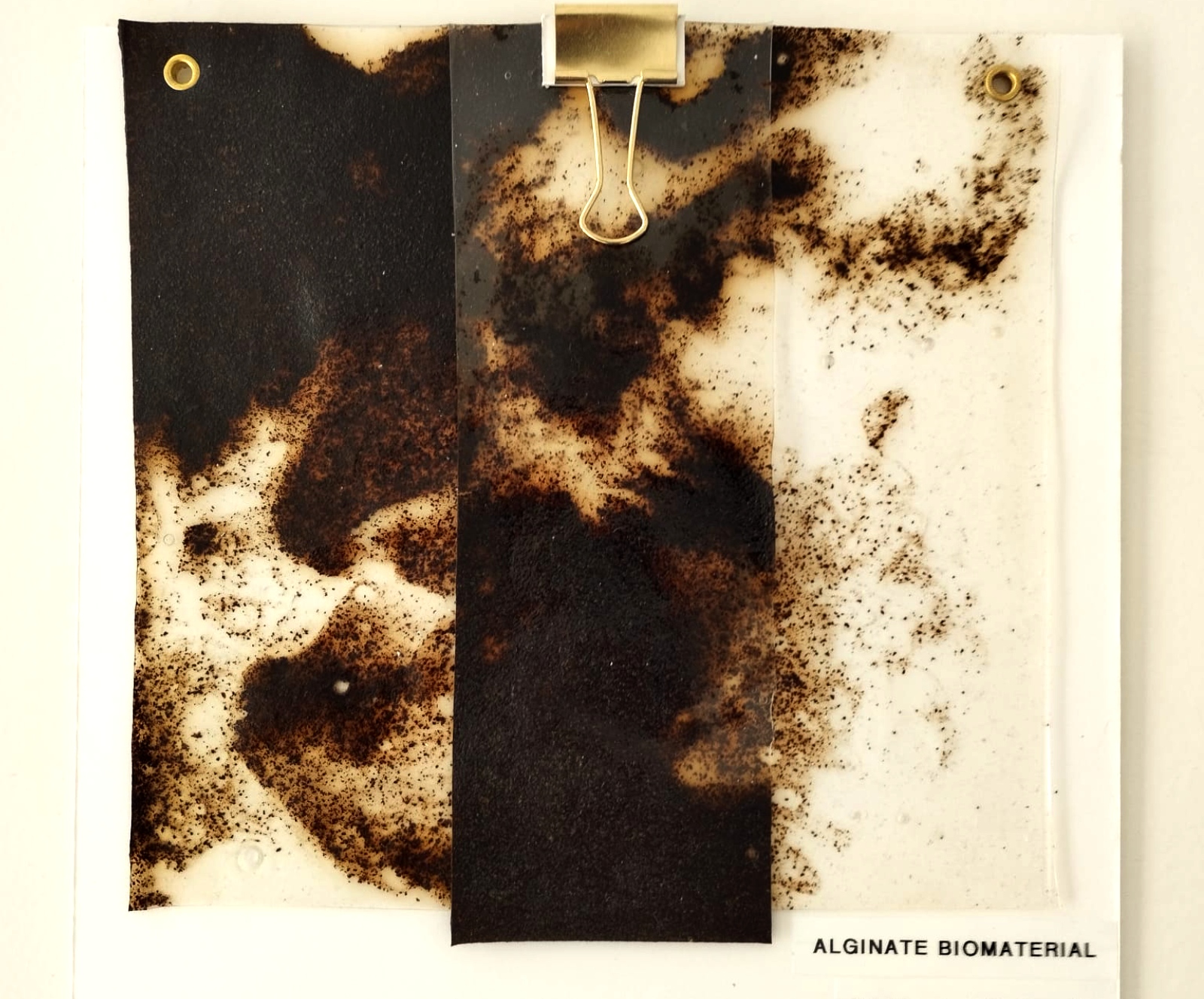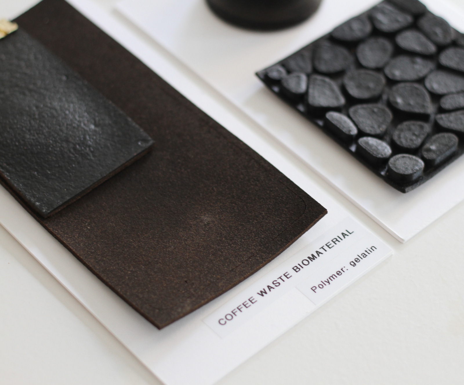 Samples of laminar and mouldable bio-materials based on coffee waste, different polymers were added according to the recipe such as: alginate, animal and plant-based gelling agents.