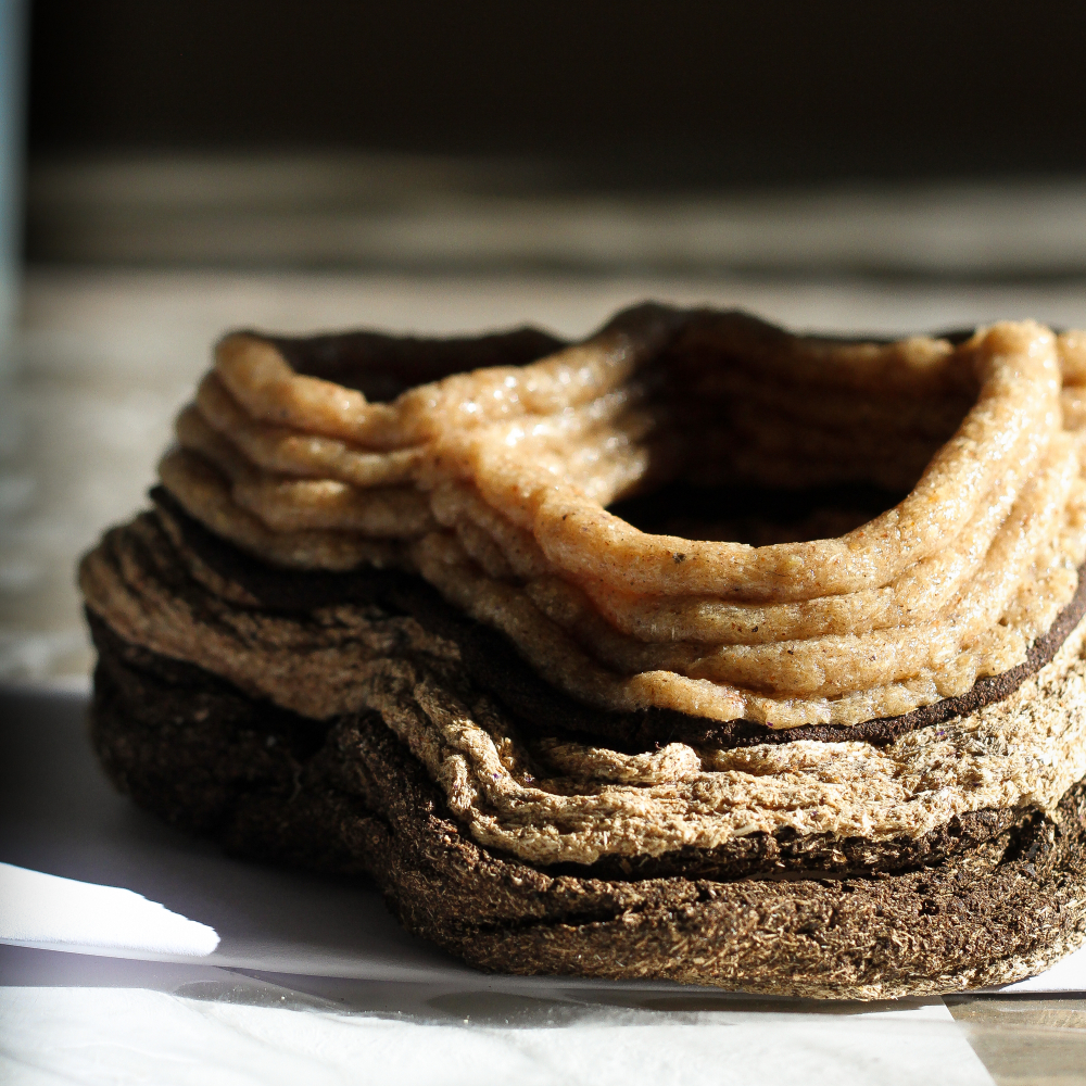 Samples of bio-materials in paste form, suitable for manual extrusion, modelling or 3D printing (fluids) based on coffee waste provided by the Örö Ravintola 12” restaurant, different gelling and thickening polymers of plant origin were added, according to the recipe.