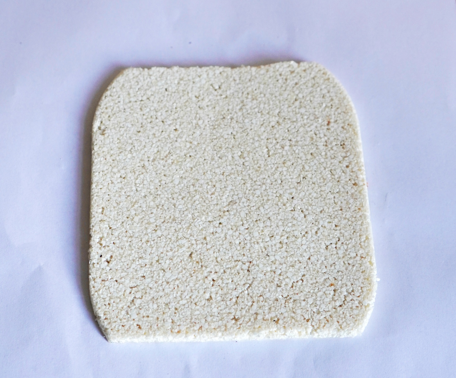 Samples of laminar and mouldable bio-materials based on wood waste, different polymers were added according to the recipe such as: alginate, animal and plant-based gelling agents.